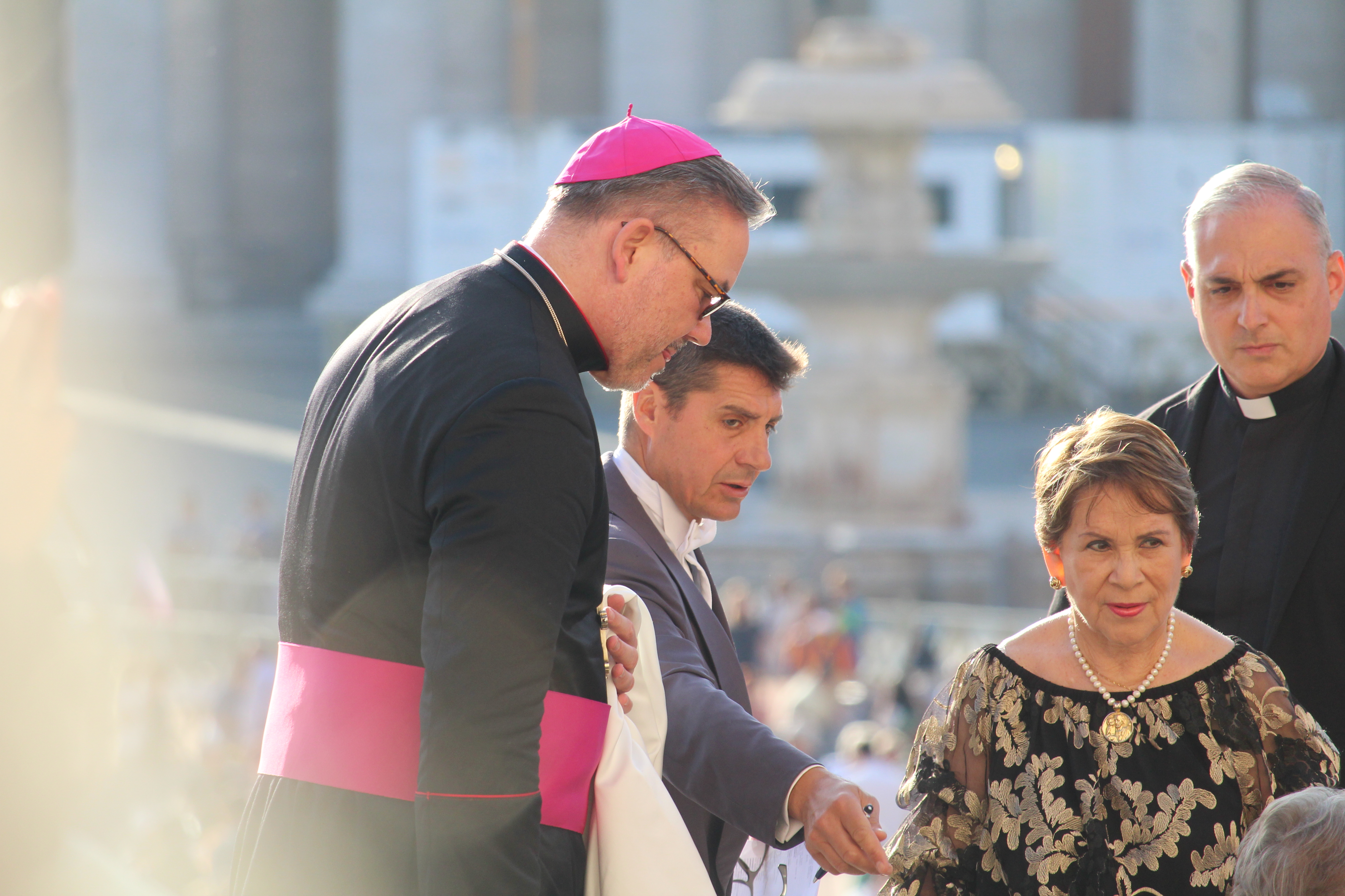 Höhepunkt der Reise war die Generalaudienz mit dem Heiligen Vater. Bei strahlendem Sonnenschein erwarteten die Pilger Papst Franziskus, der in seiner Katechese auf die Unterscheidung einging. Der Hochmeister konnte dem Heiligen Vater die Grüße der Ordensfamilie überbringen und Papst Franziskus bat um das Gebet Brüder, Schwestern und Familiaren, was der Hochmeister gerne versicherte.