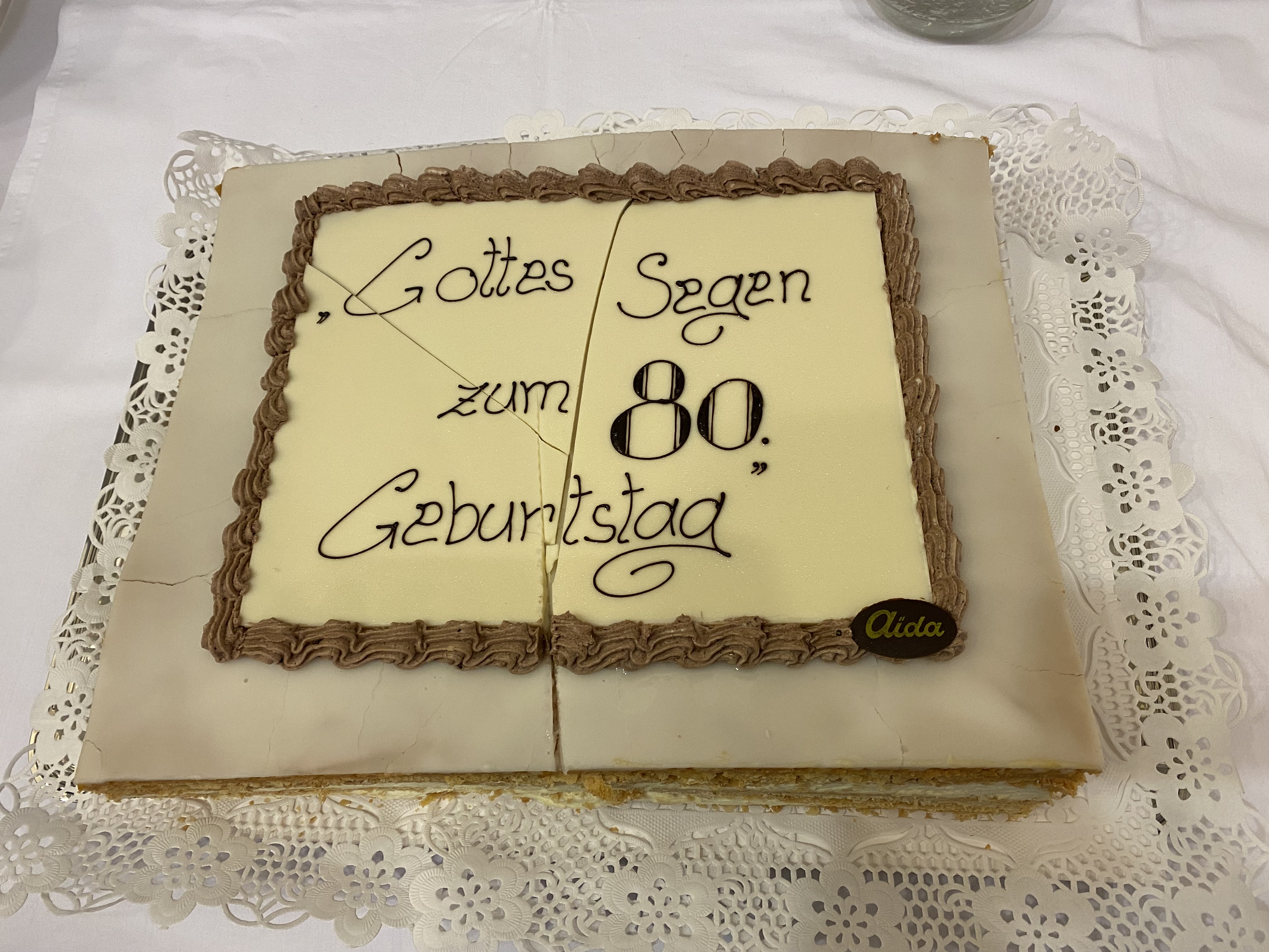 Die Gottesdienstfeier und vor allem der anschließende Empfang hatten auch einen persönlichen Aspekt des Dankes, galt es doch den 80. Geburtstag von Dr. Friedrich Vogel zu begehen. In zweifacher Art und Weise dient er seit Jahrzehnten dem Orden: einerseits in seiner geistlichen Funktion als Ständiger Diakon, andererseits als langjähriger Mitarbeiter im Deutschordenszentralarchiv, wo er sich um die Urkundensammlung und die Digitalisierung der Bibliothek große Verdienste erwarb, wie Hochmeister Frank in seiner Laudatio betonte. Dr. Vogel dankte nicht nur dem Hochmeister für das Vertrauen zunächst als Leiter des Archivs und nun als Hochmeister, sondern bedankte sich auch bei seiner Gattin, die ihn so oft entbehren musste, damit er seiner Leidenschaft im Zentralarchiv nachgehen konnte. Auch das Versprechen, dass solange es die vom Herrgott für ihn vorgesehenen Kräfte zuließen, er für das Archiv nützlich sein will, bekräftigte der Jubilar vor der versammelten Festgesellschaft. Das herzliche Beisammensein bei einem kräftigen Essen und einer wohlschmeckenden Geburtstagstorte in den Räumen des Hochmeisteramtes bildeten den Abschluss des Gründungsfestes in der Singerstrasse.